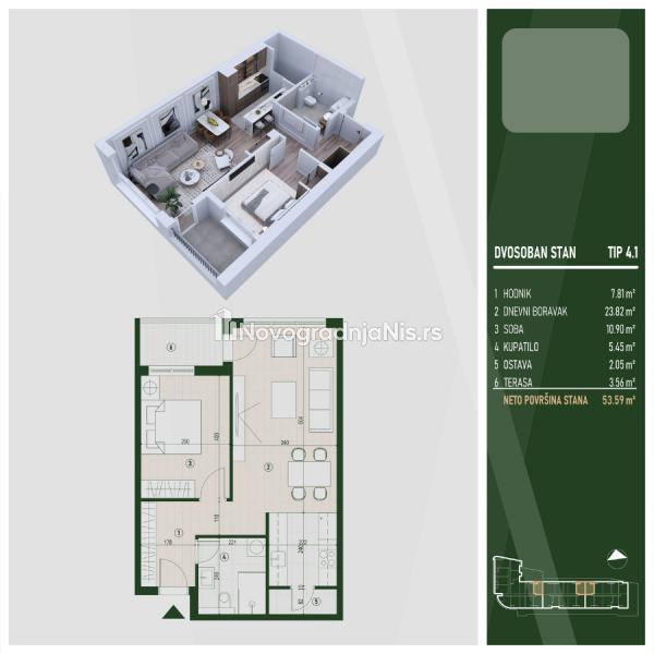 Čair, 53.59m2, dvosoban stan u novogradnji