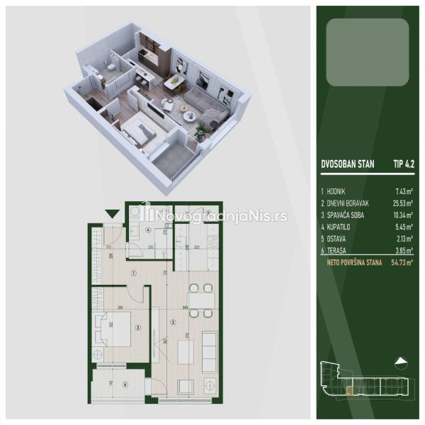 Čair, 54.73m2, dvosoban stan u novogradnji