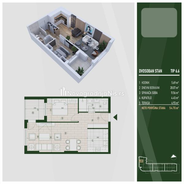 Čair, 54.7m2, dvosoban stan u novogradnji