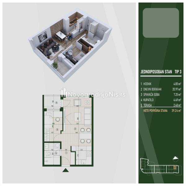Čair, 39.24m2, jednoiposoban stan u novogradnji