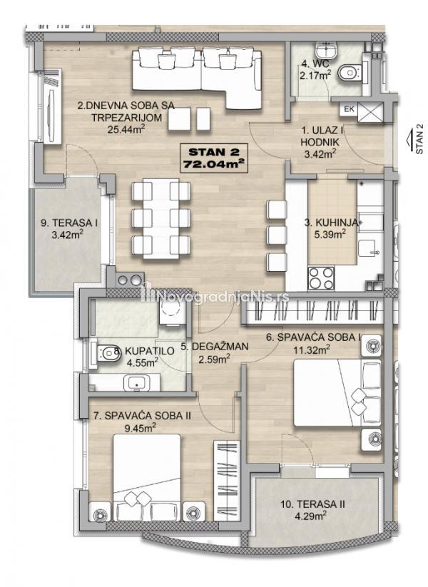 Čalije, 72.04m2, trosoban stan u novogradnji